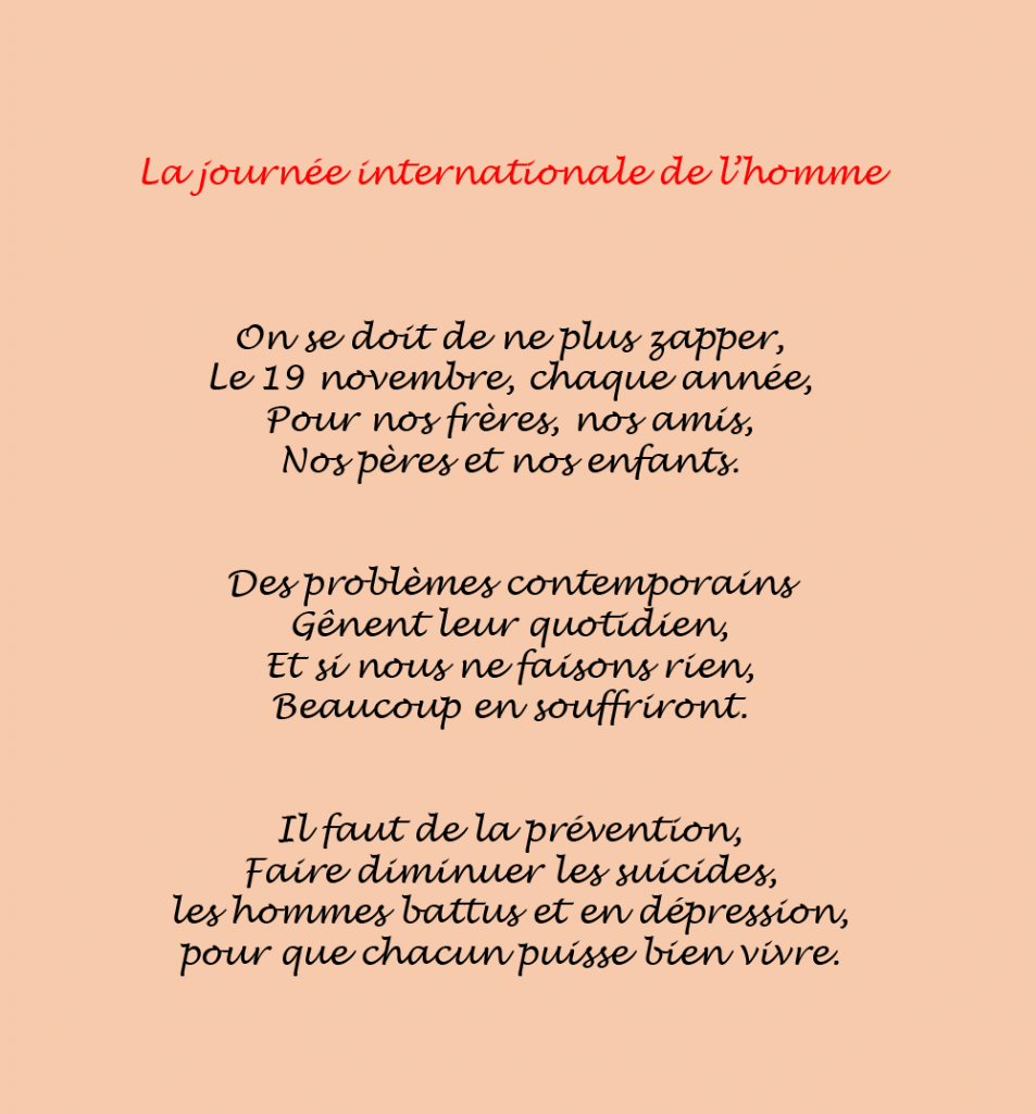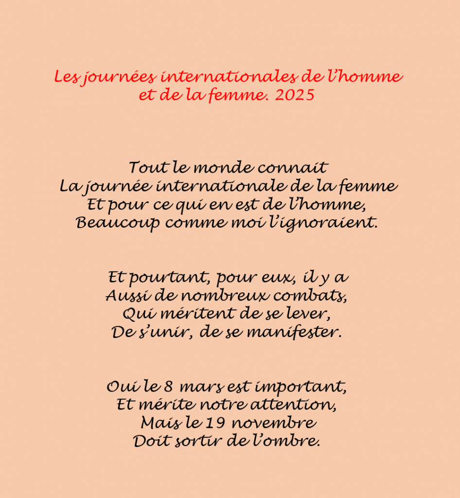 Rajart voulait conclure cette journée internationale de l’homme de manière poétique, le lien pour le poème audio , et ci-dessous les poèmes :