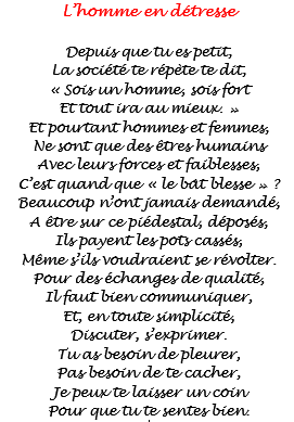 “Men experiencing depression often display attitudes that are very distinct from those of women in the same state. They thus have much more difficulty accepting their situation and willingly practice denial… More explosive, the masculine character leads to excesses such as flight and alcohol, when it is not violence…”