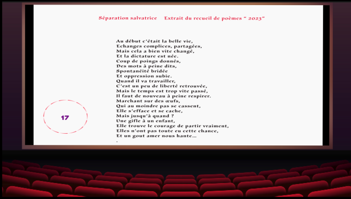 On peut même se dire que personne n’est à l’abri, que cela commence par des mots pas très agréables et finit souvent par une claque. Ne détournons pas les yeux parce que ce n’est pas très beau, si on veut sauver des vies, n’hésitons pas, il faut réagir. Bien sûr que la peur est là, et parfois c’est la victime qui ne nous permet pas de l’aider comme on voudrait. Mais je vous assure, votre conscience tôt ou tard vous rattrapera si vous ne le faites pas.